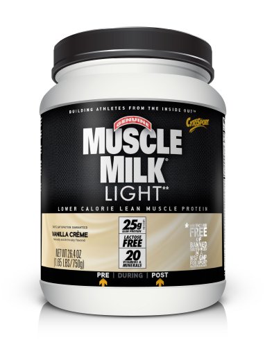 CytoSport has been overwhelmed by the amazing success of Muscle Milk. If there has been one repeated request, it's "Make Muscle Milk with less fat and fewer calories, but keep the Same Great Muscle Milk Taste!" Well, we heard you. Introducing Muscle Milk Light Same great performance - same great taste with 50% less fat and 33% fewer calories than Genuine Muscle Milk. Muscle Milk Light is scientifically designed for individuals who want to maximize lean muscle gains while reducing caloric intake. Precision Protein Blend Muscle Milk Light contains a precise blend of rapid releasing whey and slower digestingmicellar casein from Milk Protein Isolate/Concentrate and Calcium and Sodium Caseinate to create a constant supply of amino acids, the building blocks of muscle tissues. Choose The Right Kind of Fat! The LeanLipids used in Muscle Milk Light are more likely burned for muscle energy and heat than stored as fat. Medium-chain triglycerides (MCT), the pre-digested, "fast-burning fats" help provide the caloric energy needed to fuel exercise and recovery. Polyunsaturated and Monounsaturated fatty acids from canola and sunflower oil provide essential omega-3, 6 & 9 fatty acids. Choose Carbohydrates Wisely. Zero-lactose, starch-based complex carbs found in Muscle Milk Light, supply energy to the body in the form of glucose. Glucose is the only energy source for red blood cells and a preferred energy source for exercising muscles that are operating anaerobically.